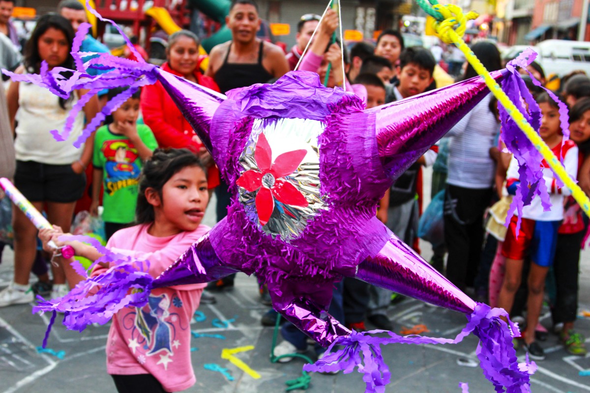 Vecinos se reúnen en la Plaza de la Soledad, justo frente a la parroquia para celebrar una posada navideña y romper una piñata qué fue donada por miembros de la RAIIS. A pesar de las condiciones de marginación de la comunidad, costumbres como esta son inculcadas a los más jóvenes para fortalecer su identidad y su vínculo con la comunidad.