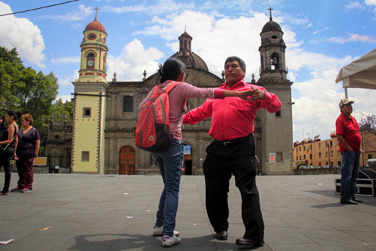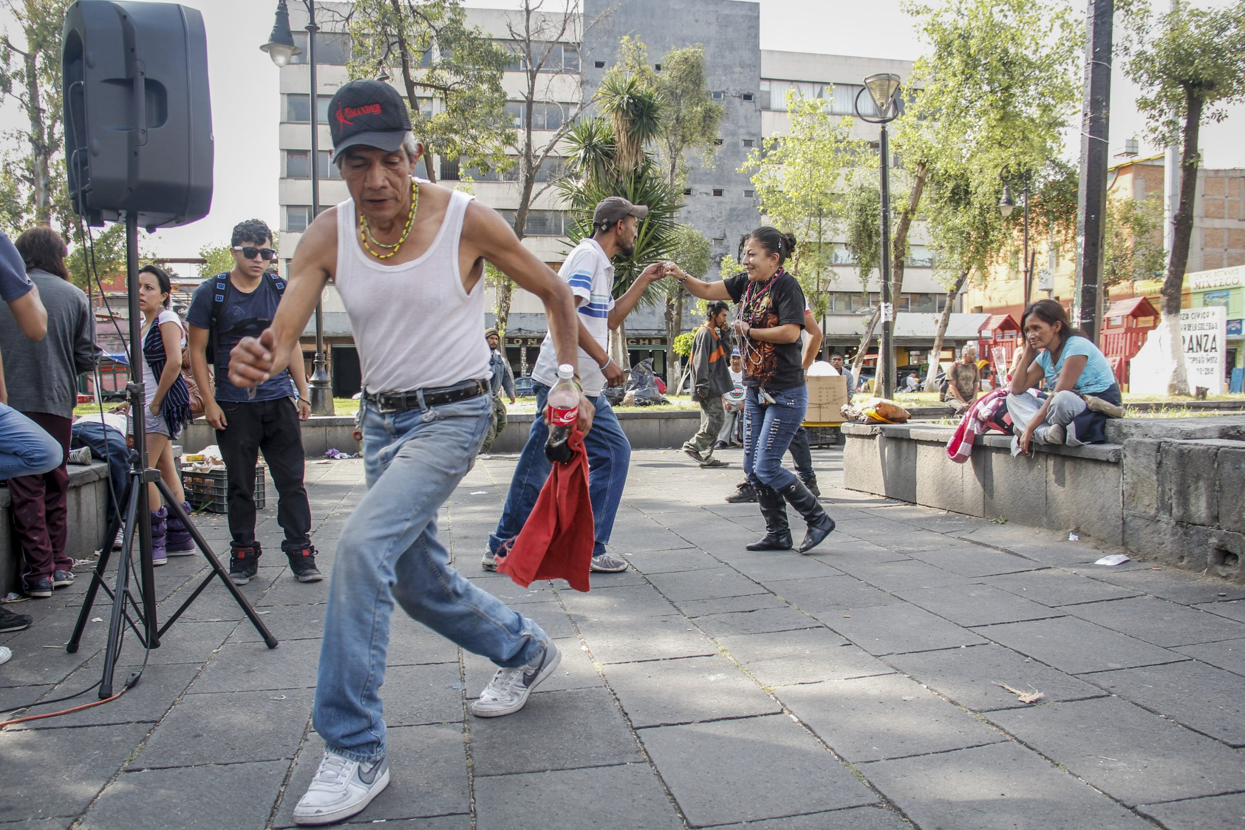 Vecinos, transeúntes y personas en situación de calle bailan improvisadamente en los pasillos del Jardín de la Soledad durante una transmisión de la radio bocina comunitaria Radio Aguilita que cada jueves se instala en jardín para recperar la historia oral de los habitantes y recuperar sus demandas y necesidades.