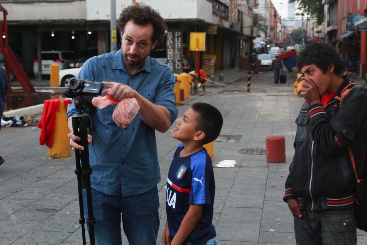 Mirar al otro. Poncho de tan solo 9 años, vive en uno de los edificios colindantes a la Plaza de la Soledad, el jardín y la plaza son usados como patio de juegos donde niños y niñas conviven cotidianamente con gente de calle, trabajadoras sexuales y ladrones. En esta imagen Poncho observa con entusiasmo a un reportero mientras es observado por otro joven en situación de calle apenas 5 años mayor que él.