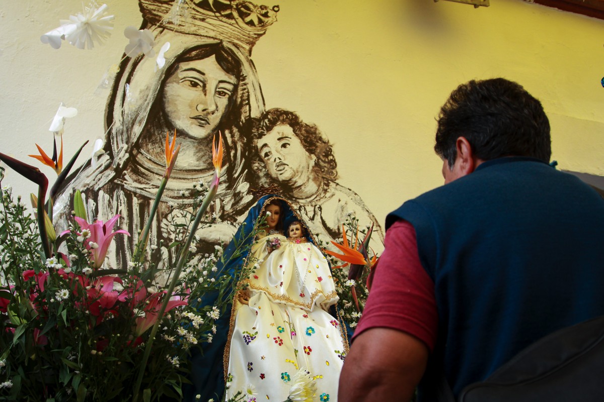 Una vecina del barrio de La Soledad rinde ofrenda a la Virgen de La Merced, patrona de la comunidad, pintada en un mural al costado de unos de los edificios habitacionales donde cientos de familias fueron reubicadas después del terremoto de 1985 en la Ciudad de México.